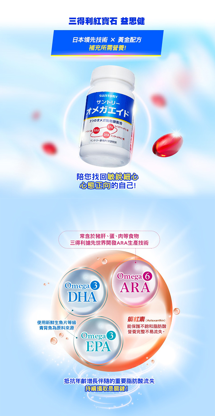 魚油(魚油(含 DHA&EPA)、混合濃縮生育醇(抗氧化劑 ))、明膠、高山被孢黴發酵產物萃取物(高山被孢黴發酵產物 萃取物、混合濃縮生育醇(抗氧化劑 )) (含花生四烯酸)、甘油、紅藻萃取物(紅藻萃取物、混合濃縮生育醇(抗氧化劑 ))。