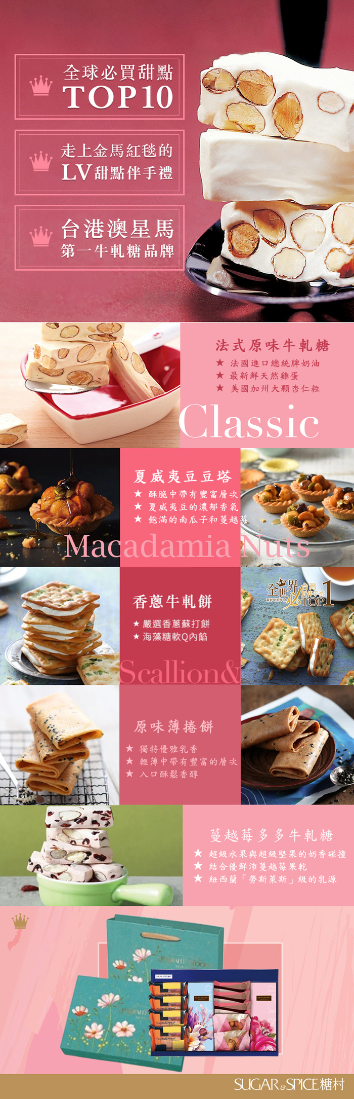 內容物 : 原味薄捲餅4入+法式牛軋糖126g+蔓越莓牛軋糖108g+牛軋餅-鹽風味3人+夏威夷豆豆塔2入