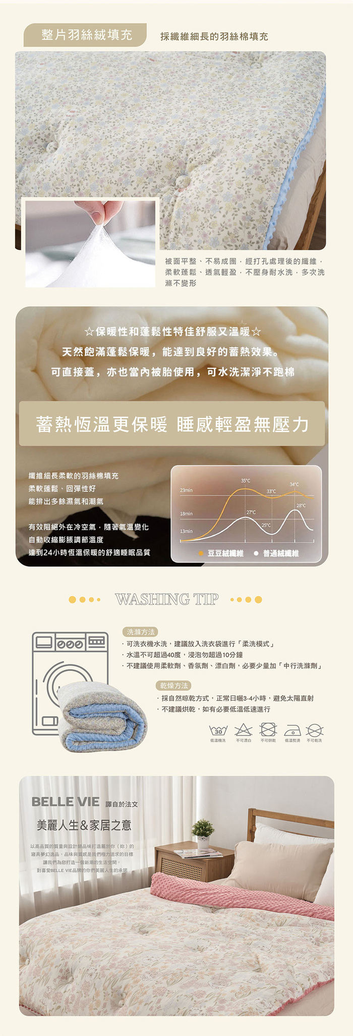 天然飽滿不壓身、不跑棉,被芯含有大量的空層,能阻止外部冷空氣進入及內部熱空氣散發,以達到良好的保暖效果。