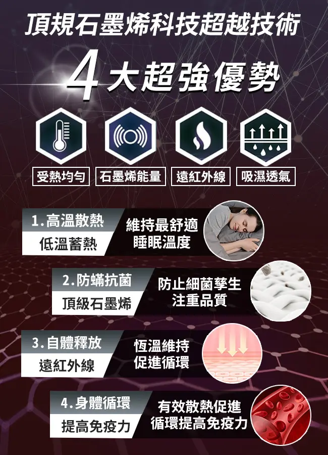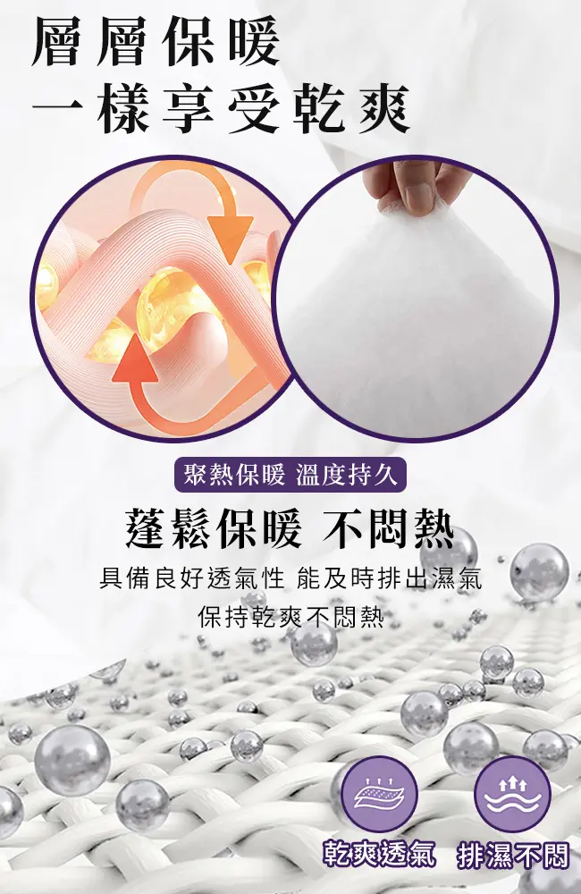 完美吸濕排汗功能調節肌膚溫度,入眠使您更加備感舒適、好像睡在雲朵上~