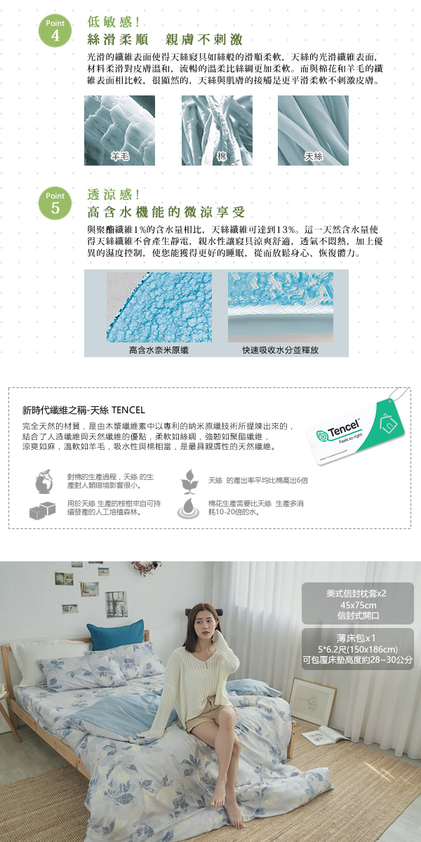 ◇尺寸:雙人床包-5×6.2尺(152×188公分)±3%/可包覆床墊厚度:約35公分±3%;美式信封枕套-45×75公分±3%