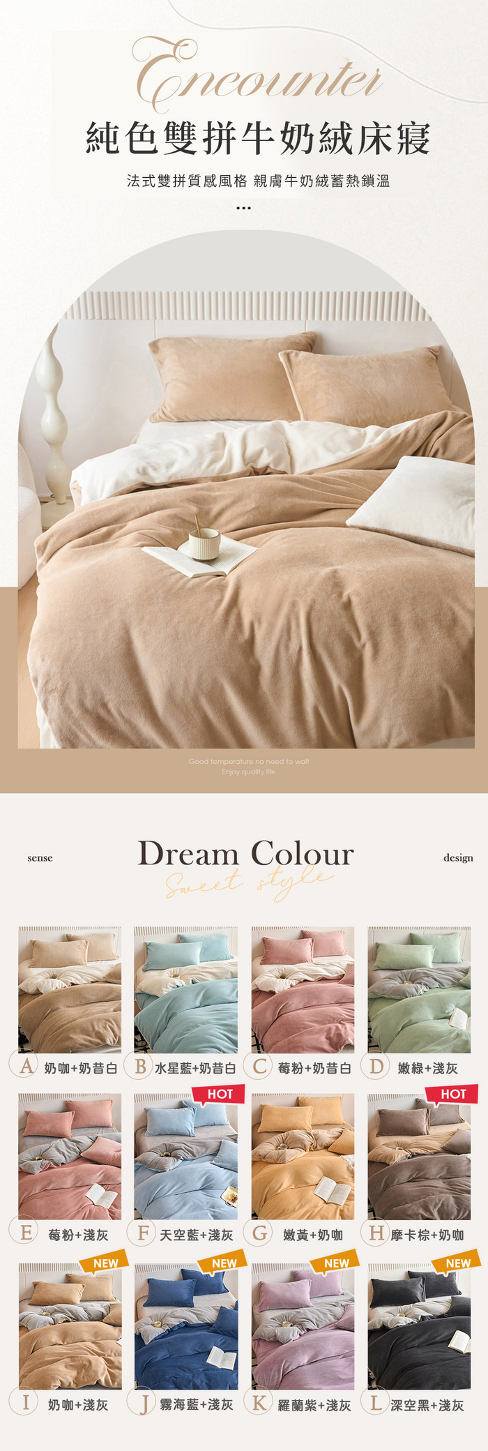 優雅純色寢具 超柔軟親膚觸感,豐厚絨毛,細膩順滑。入被保暖、熱感蓄溫,有效阻隔冷空氣,溫暖冷冷的冬天。