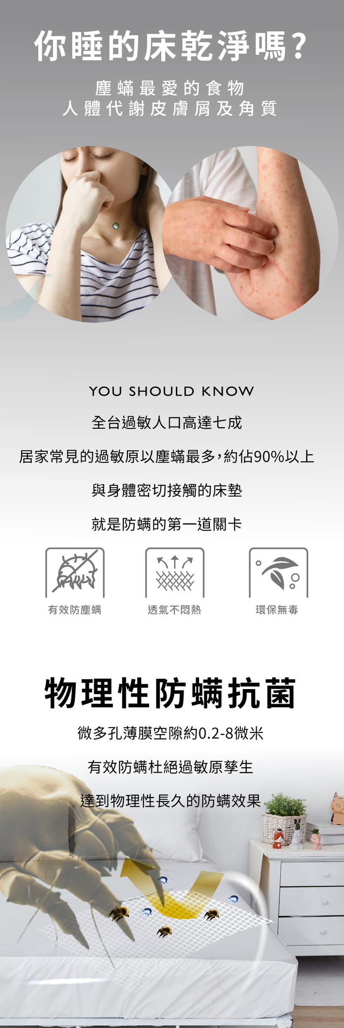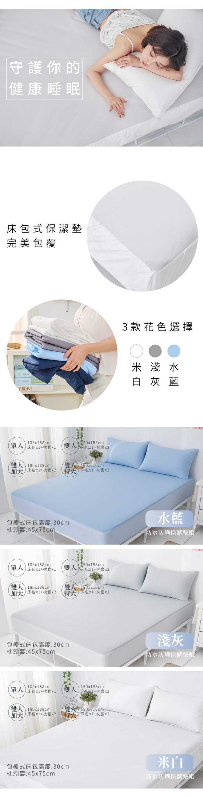 內容:單人枕頭套為1件.雙人款式為2件. 床包式保潔墊1件. 床包尺寸:105x188x30cm 枕套尺寸:45x75cm 表布材質:100%polyester3M吸濕排汗 底布材質:TPU防水透濕薄膜 產地:台灣製造