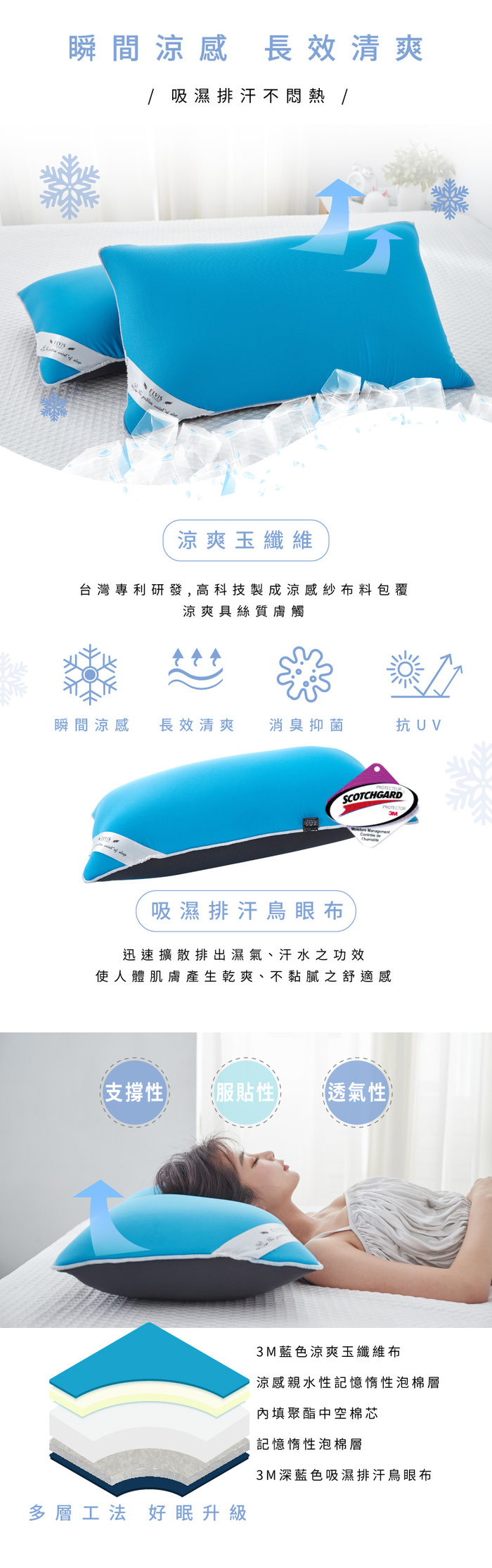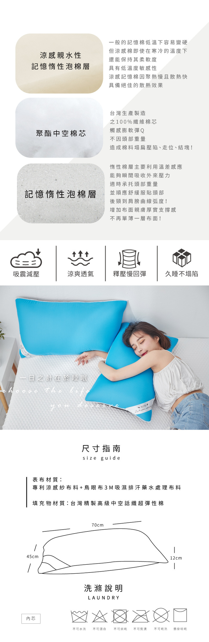 材質/ 布面:100%聚酯纖維 藍色:涼爽玉纖維布貼和涼感惰性記憶棉 深藍色:吸濕排汗藥劑處理鳥眼布貼和惰性記憶棉 填充物:100%聚酯纖維 尺寸:45x70x12cm 原產地(國):台灣