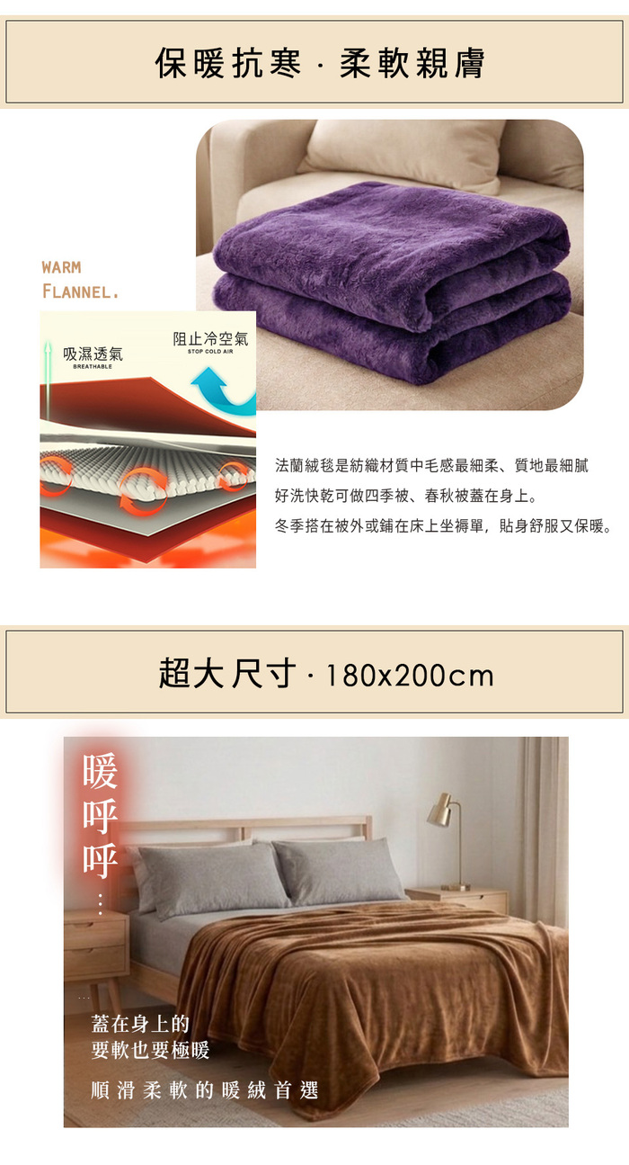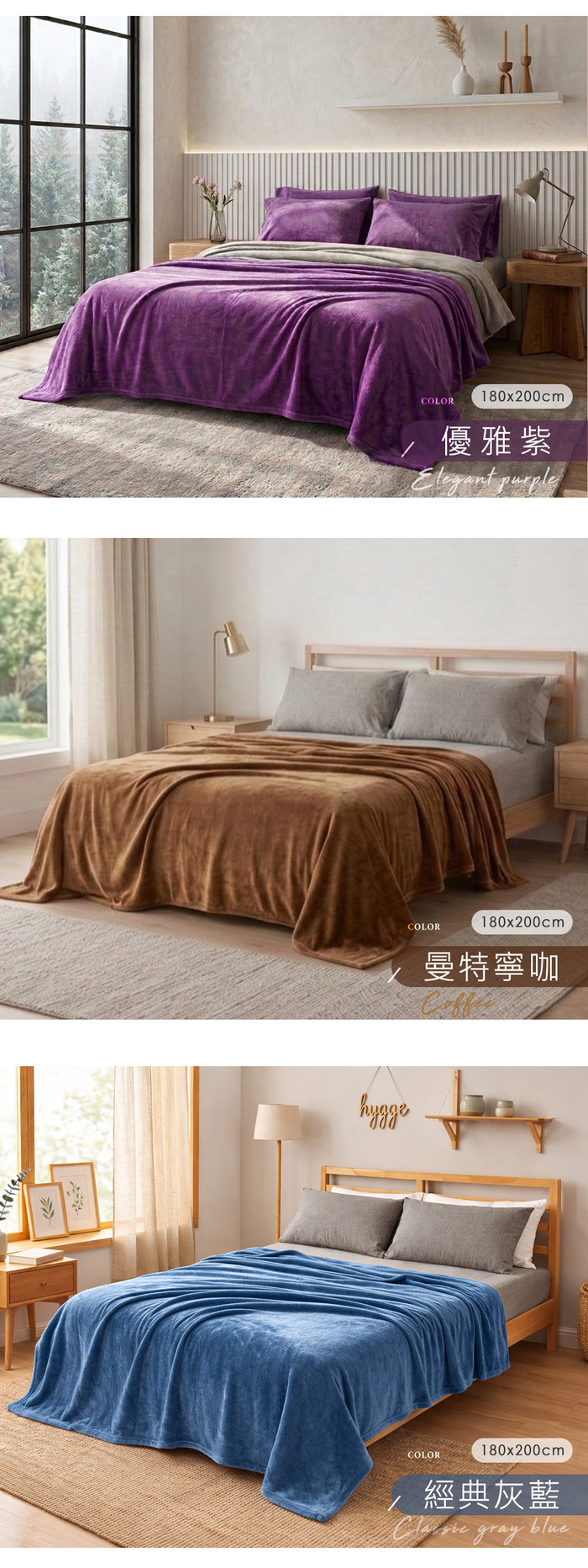 從客廳到臥室或是汽車裡,體積小好收納不佔空間,冬天可蓋也可平鋪於床上增加舒適度與保暖度。耐洗不褪色、不起毛球,是您在寒冷的冬季必備寢具。