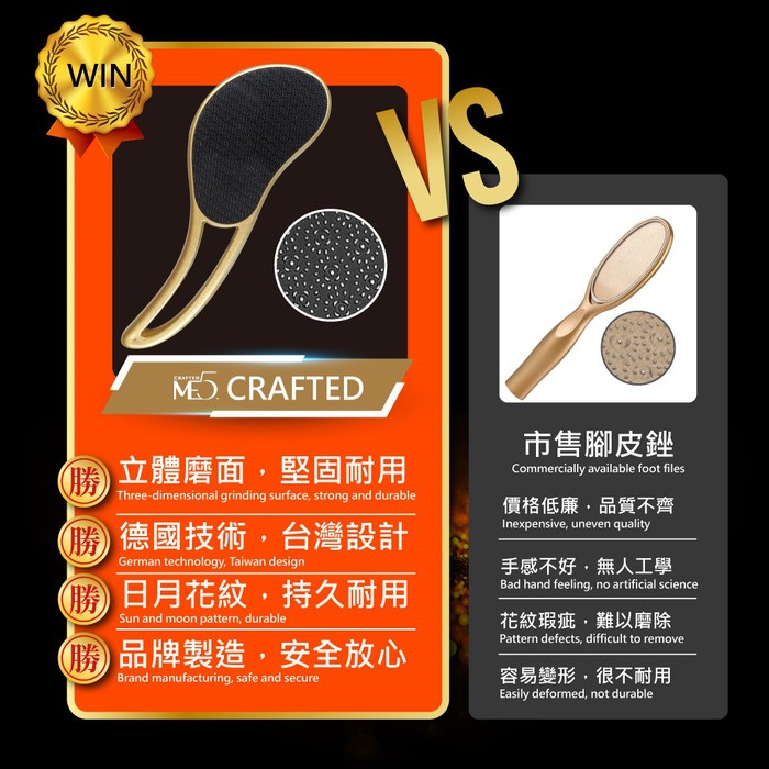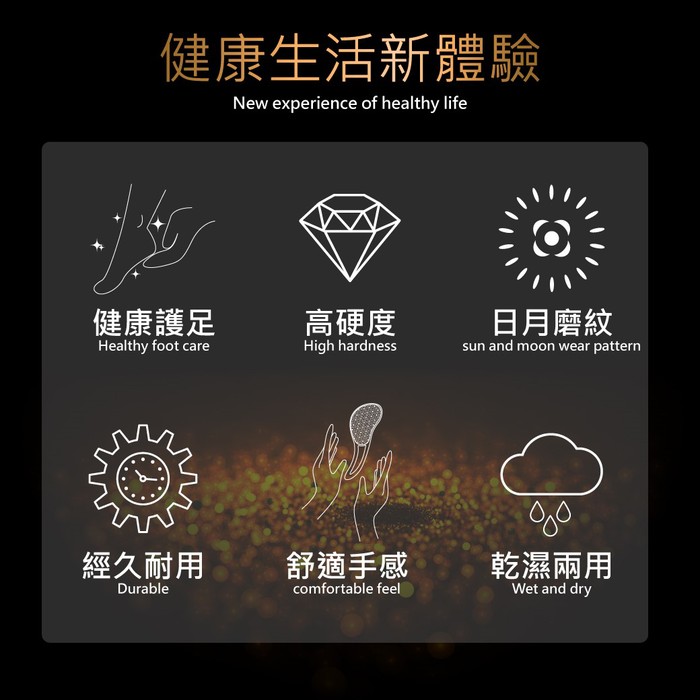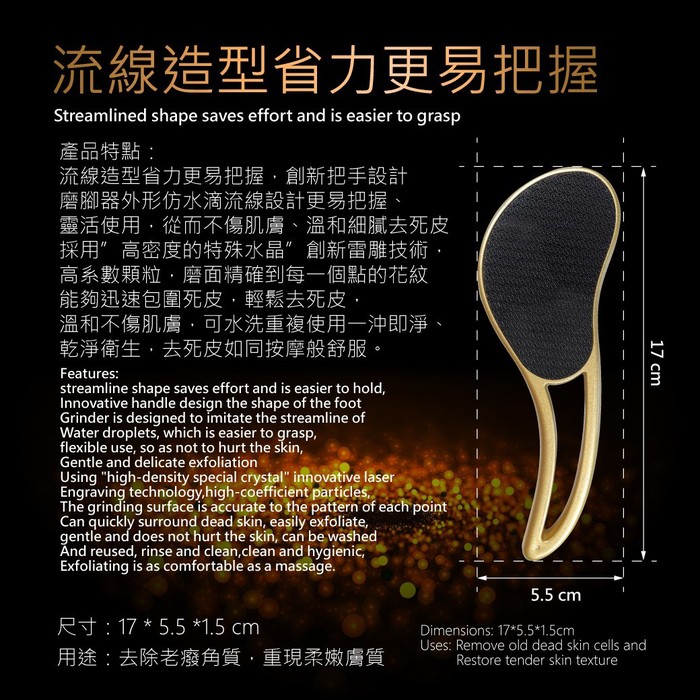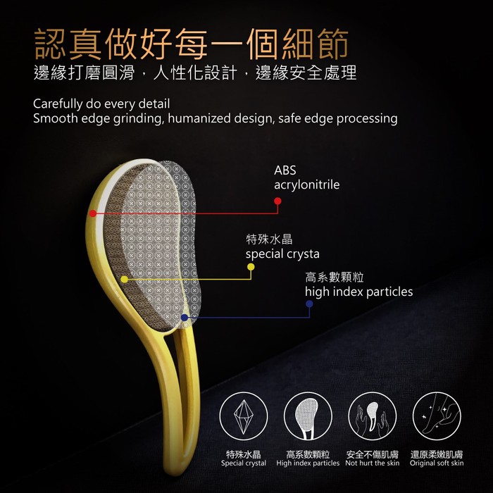 產品特點:流線造型省力更易把握,創新把手設計,磨腳器外形仿水滴流線設計更易把握、靈活使用,從而不傷肌膚、溫和細膩去死皮,採用”高密度的特殊水晶”創新雷雕技術, 高系數顆粒,磨面精確到每一個點的花紋,能夠迅速包圍死皮,輕鬆去死皮,溫和不傷肌膚,可水洗重複使用一沖即淨、乾淨衛生,去死皮如同按摩般舒服。