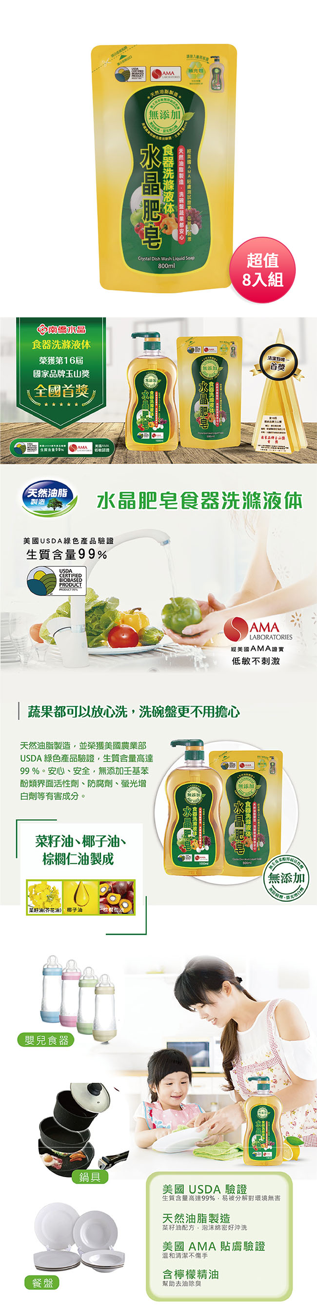 南僑 水晶肥皂食器洗滌液體補充包800ml超值家庭號8入組 台灣製