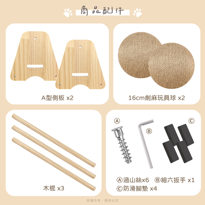 .包裝內含:實木側板 x2、16cm劍麻球 x2、木棍 x3、