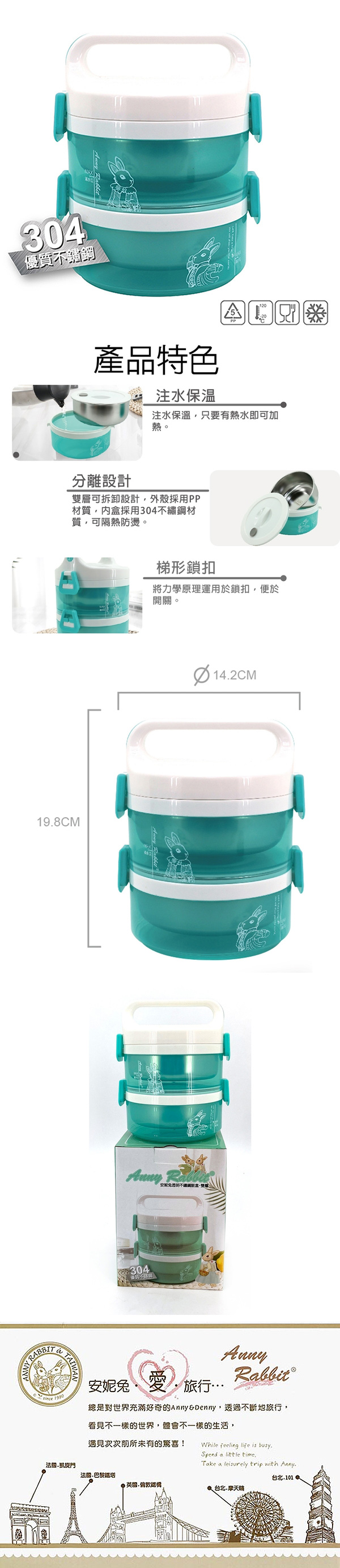 安妮兔 內膽304透明不鏽鋼雙層便當盒(700ml+700ml) UP-D32