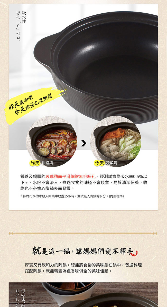 吸水率0.5%以下,食材氣味不殘留,容易清洗;一般市售陶土鍋吸水率3-5%,毛細孔會吸附食材味道,長時間不使用,容易滋生細菌與發霉。