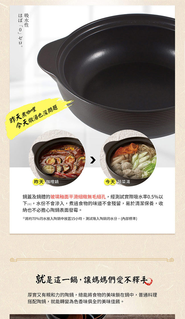 吸水率0.5%以下,食材氣味不殘留,容易清洗;一般市售陶土鍋吸水率3-5%,毛細孔會吸附食材味道,長時間不使用,容易滋生細菌與發霉。