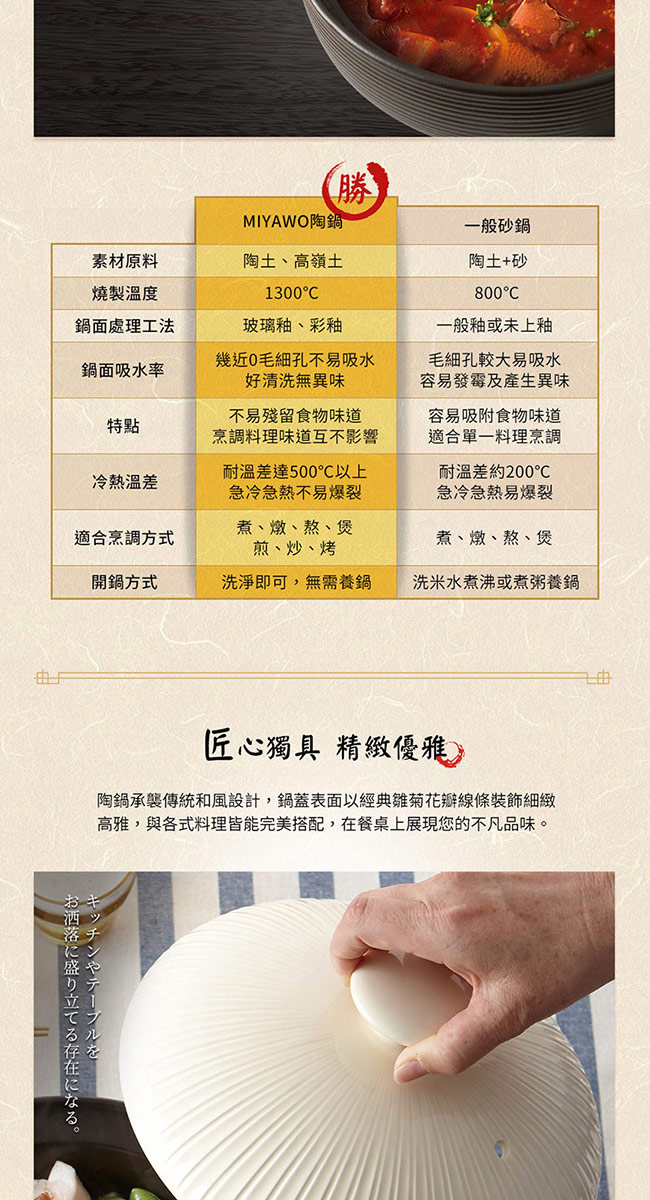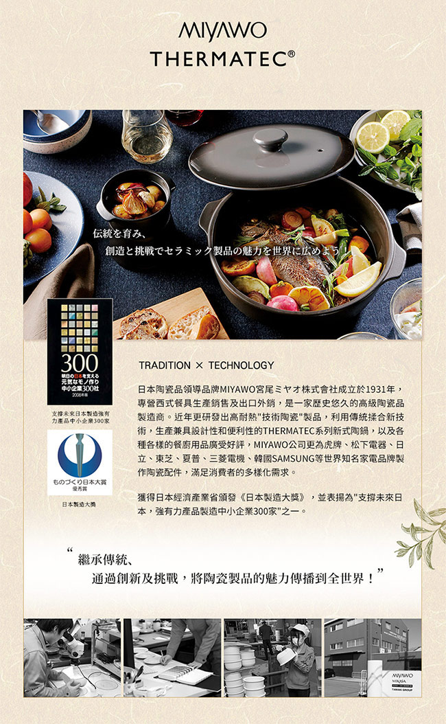 MIYAWO陶土鍋成立於1930年,是一家歷史悠久的高級陶瓷品製造商,曾獲得日本經濟產業省頒發《日本製造大獎》,並表揚為"支持明天的日本製造健康的產品300企業之一"。