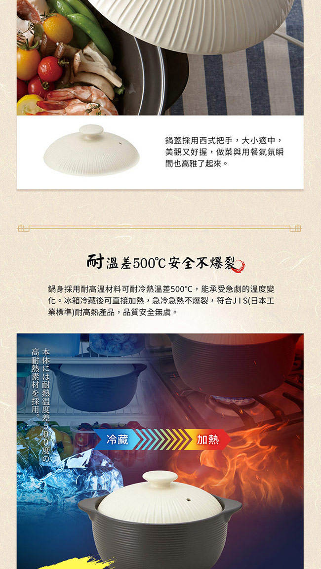 冷熱溫差可達500℃以上,可從冰箱取出直接加熱,品質安全無虞;一般市售陶土鍋耐溫差僅約200℃較易爆裂。