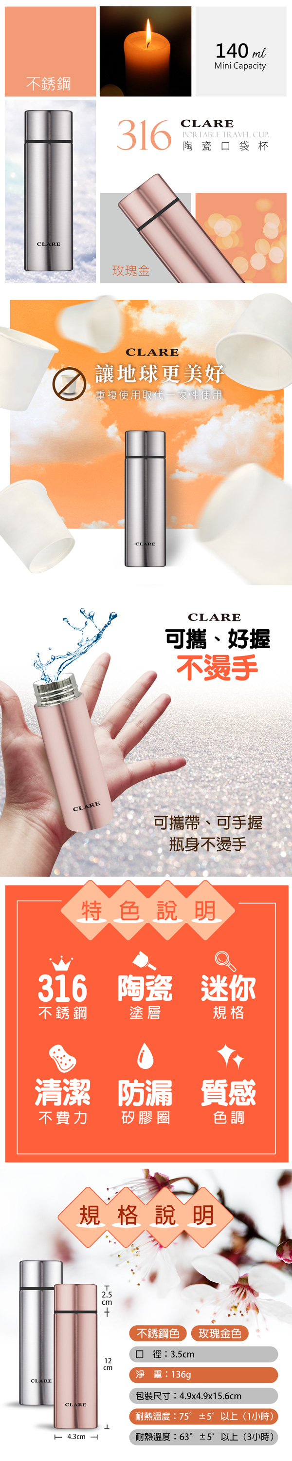 規格/型號: 140CC(不銹鋼)《CL-374414-1》4716369328599 140CC(玫瑰金)《CL-374414-2》4716369328605