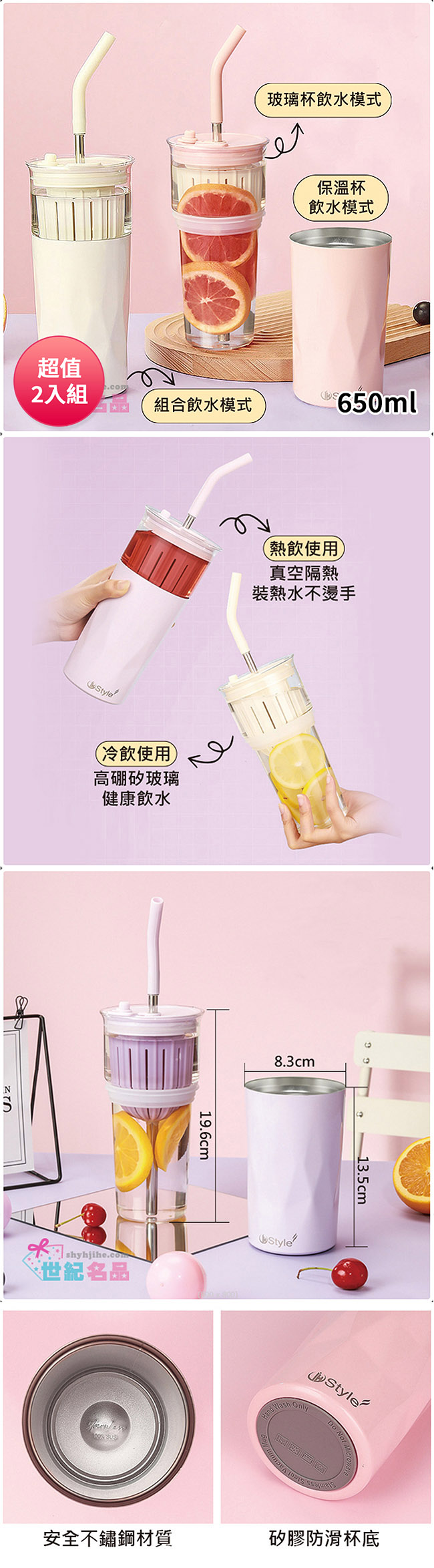 尺寸:玻璃杯部分高約19.6cm(不含吸管),保溫杯部分約直徑8.3x高13.5cm