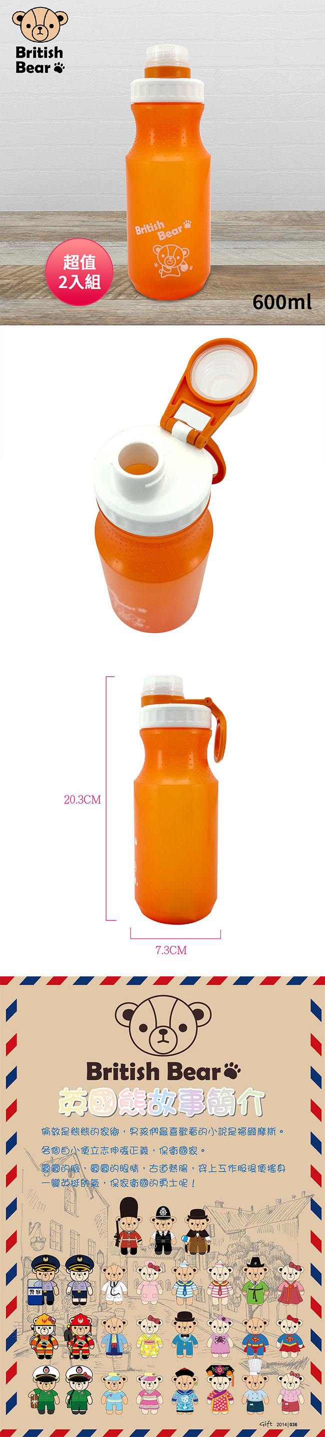 英國熊 環保隨身瓶600ml(橘色) P-B0186O 超值2入組