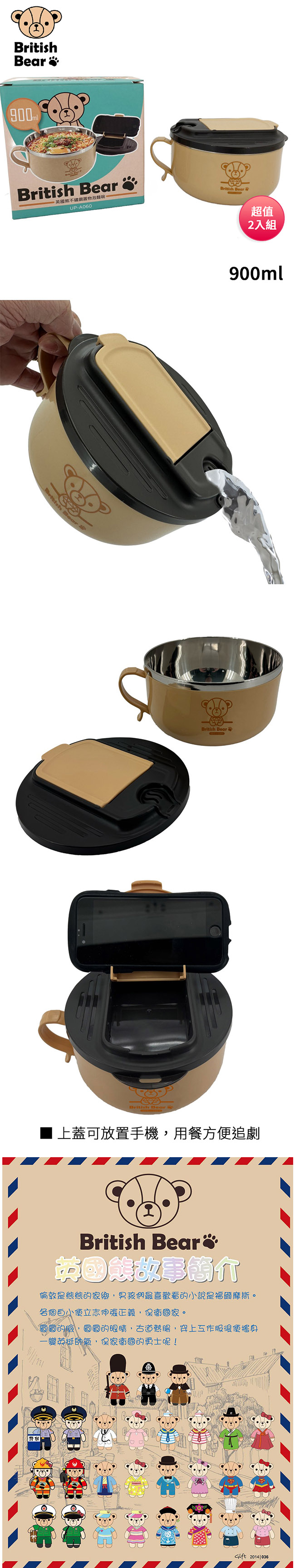 英國熊 304不鏽鋼內膽置物泡麵碗900ml UP-A060 超值2入組