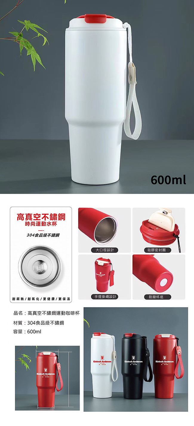 金安德森 304不鏽鋼高真空運動咖啡杯(附提繩)600ml 白色