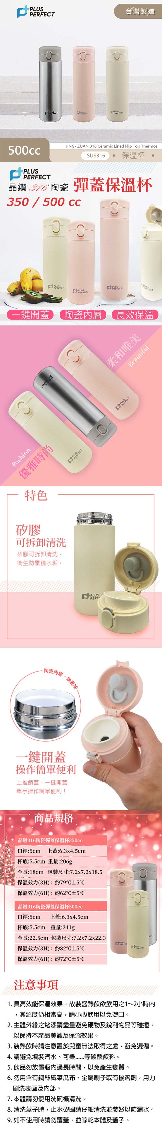 理想PERFECT 晶鑽316陶瓷彈蓋保溫杯500ml SJ-7102500 台灣製