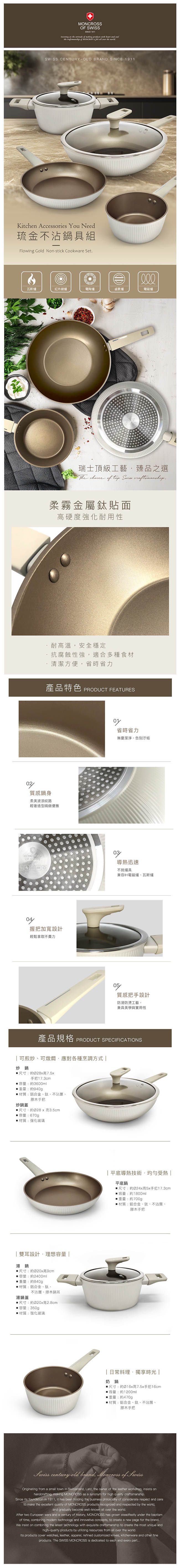 【瑞士MONCROSS】琉金不沾鍋具組(炒鍋+平底鍋+湯鍋+奶鍋) CT01C10014