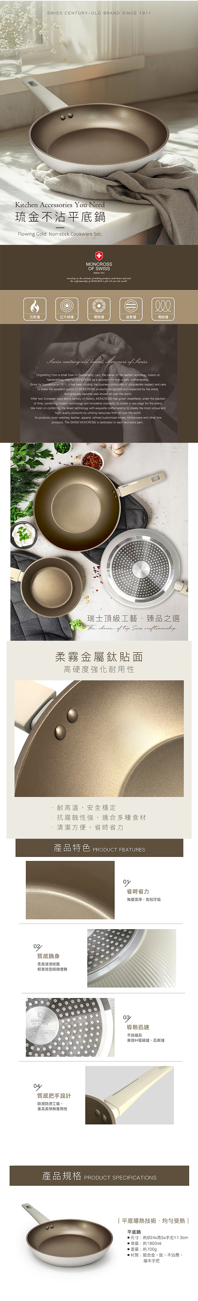 【瑞士MONCROSS】琉金不沾24cm平底鍋 AC1070B126GYGD0101