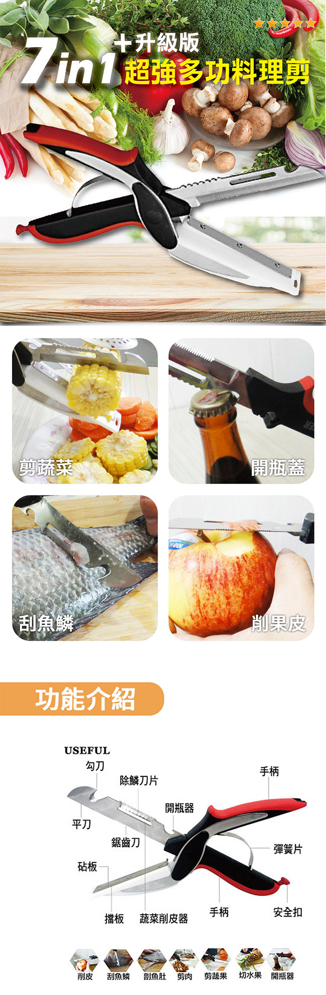 ■ 功能:削皮、刮魚鱗、剪刀、開瓶、剖魚肚、刀子、鋸齒刀