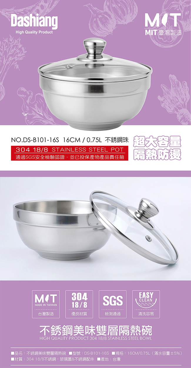 Dashiang 304不鏽鋼美味雙層隔熱碗16CM(含玻璃蓋) DS-B101-16S 台灣製