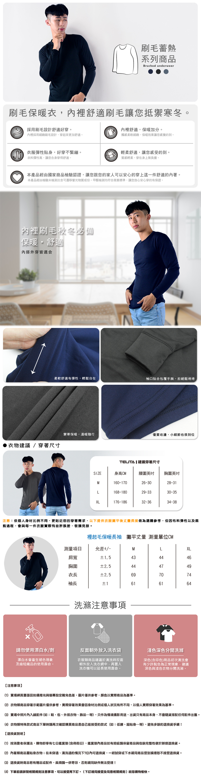 【 TELITA】蓄熱保暖刷毛圓領男上衣-L號-丈青-TA9906】