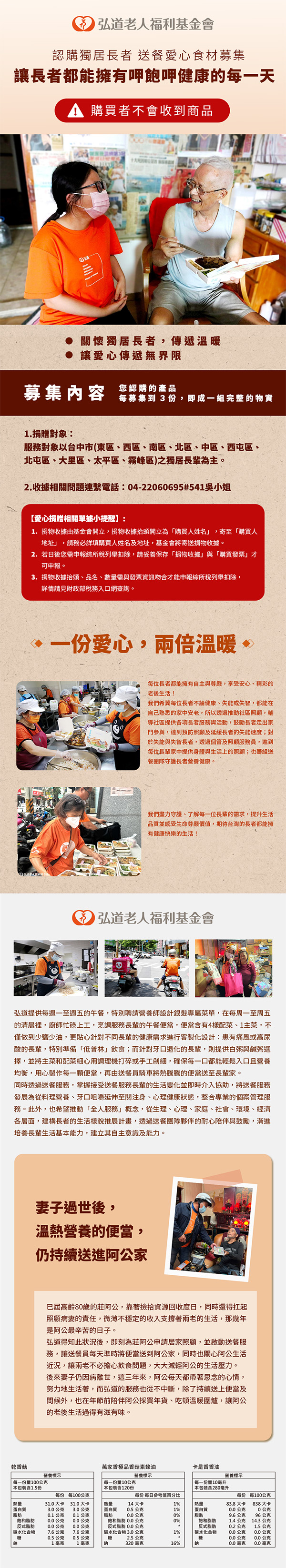 商品名稱:《弘道老人基金會》獨老送餐愛心物資募集(購買者不會收到商品)